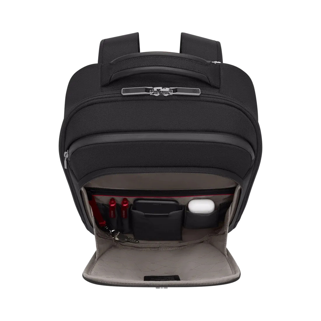 Viðskiptaferðalagið verður einföld með Compact Backpack. Hann er sniðinn til að rúma allt sem þarf, með sérstöku skipulagi fyrir vinnutengda hluti og hólf fyrir raftæki með rispuvörn, ásamt innbygðum SmartTrack vasa fyrir staðfestingartækið þitt. Þriggja hliða opnun bakpokans er hagnýt og auðveldar aðgengi. Línan er hugsuð fyrir mjög tíð ferðalög, er framleidd úr efnum í hæsta gæðaflokki og hönnuð til endast.