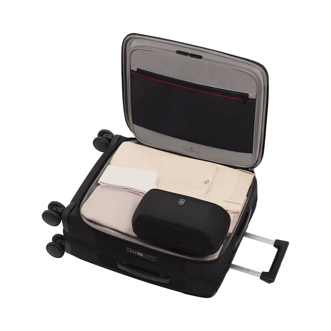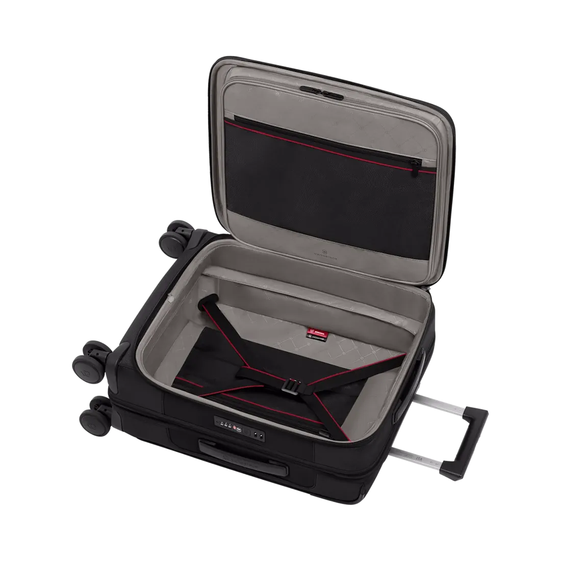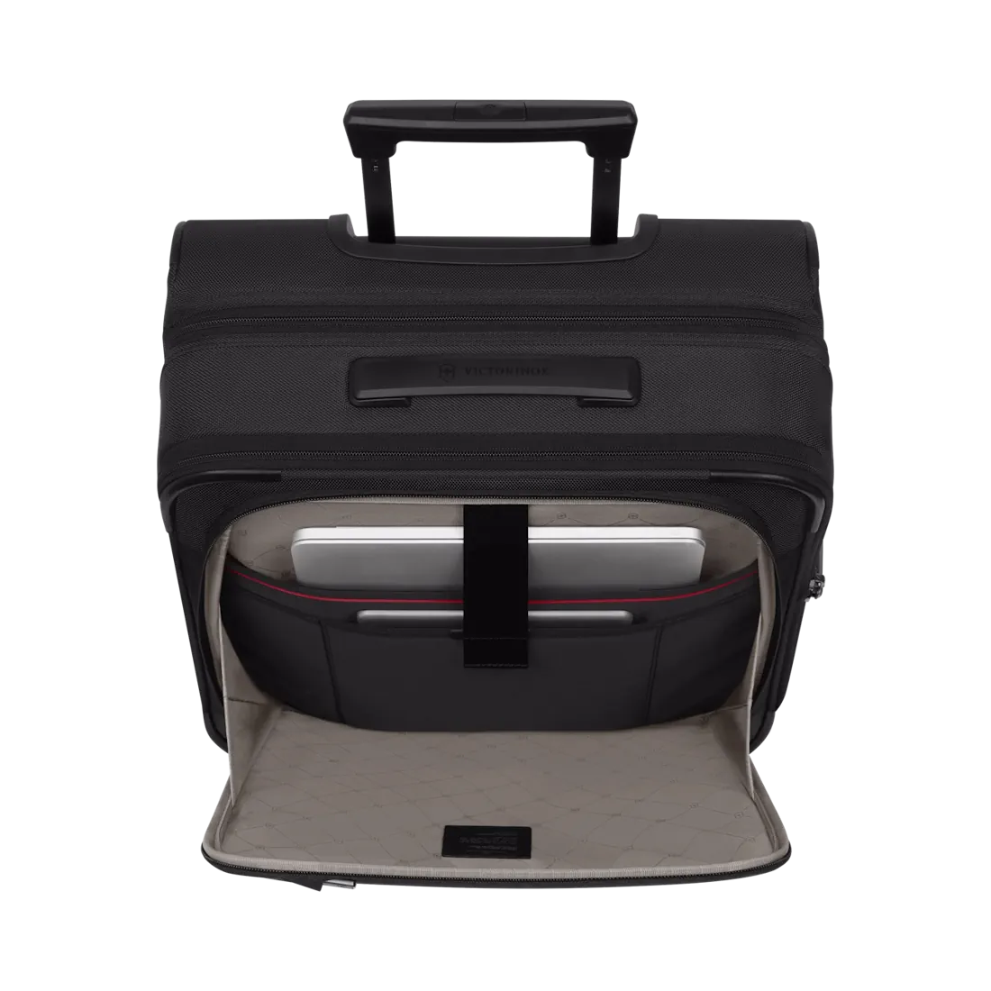 - Útdraganlegt handfang með Victorinox Stabilizing Technology PLUS (VST™) sem tryggir traust og stöðugt handfang. Innsigli meðfram handfanginu minnkar líkurnar á að vatn komist í töskuna.